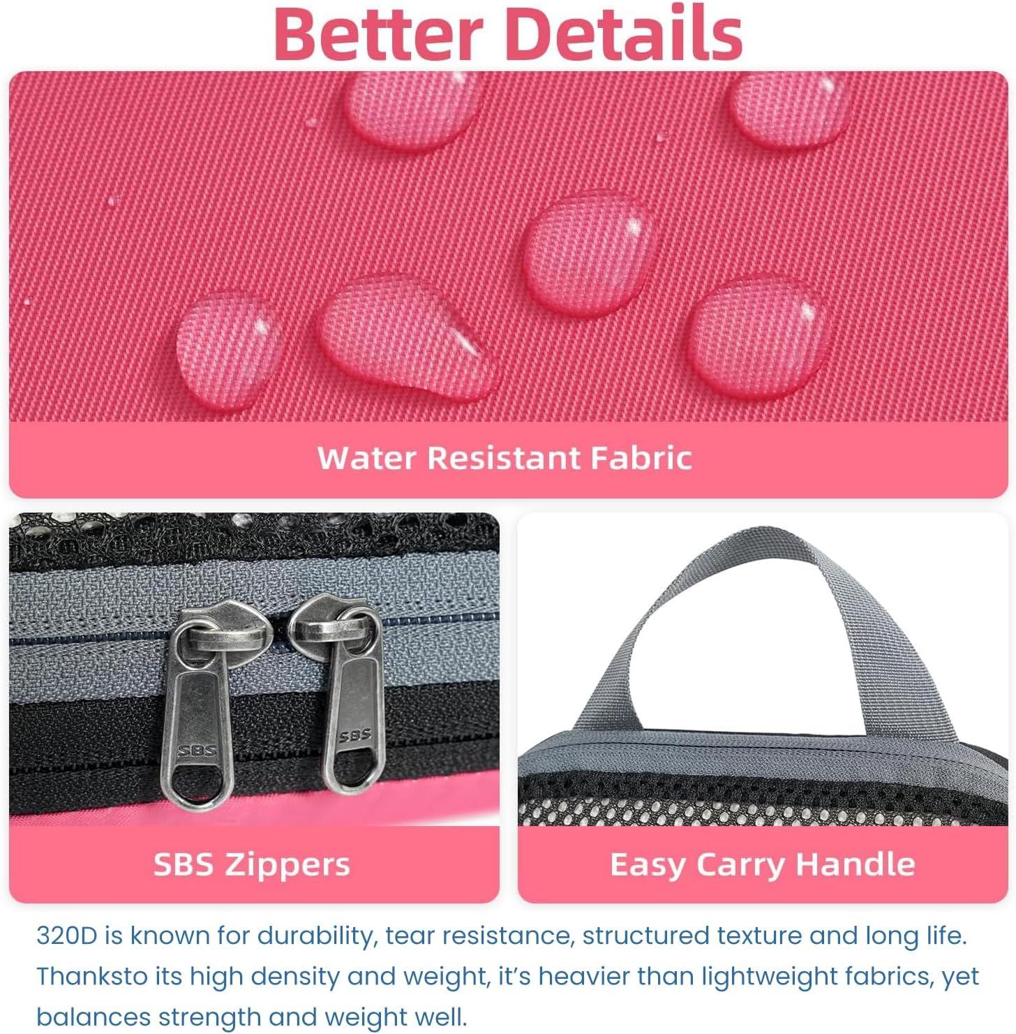 PREMIUM UPGRADED 320D FABRIC:Smooth&Soft 320D Fabric Protects Your Clothes from Wrinkles and Stains.High Performance Feature Makes Sure this Packing Cubes can Bear High Density Wear and Tear during Traveling.Water-Repellent Feature Nicely Protect Your Clothes from Spill or Leaks.Easily Store Your Clothes and Protect Your Clothes from Stains and Wrinkles.