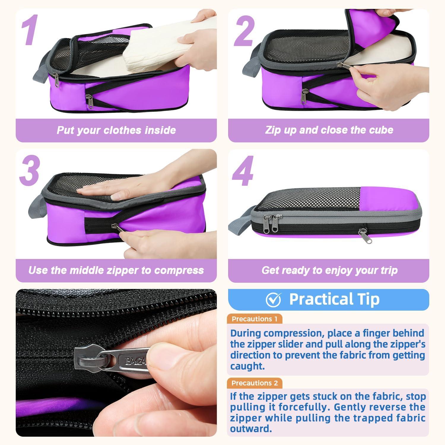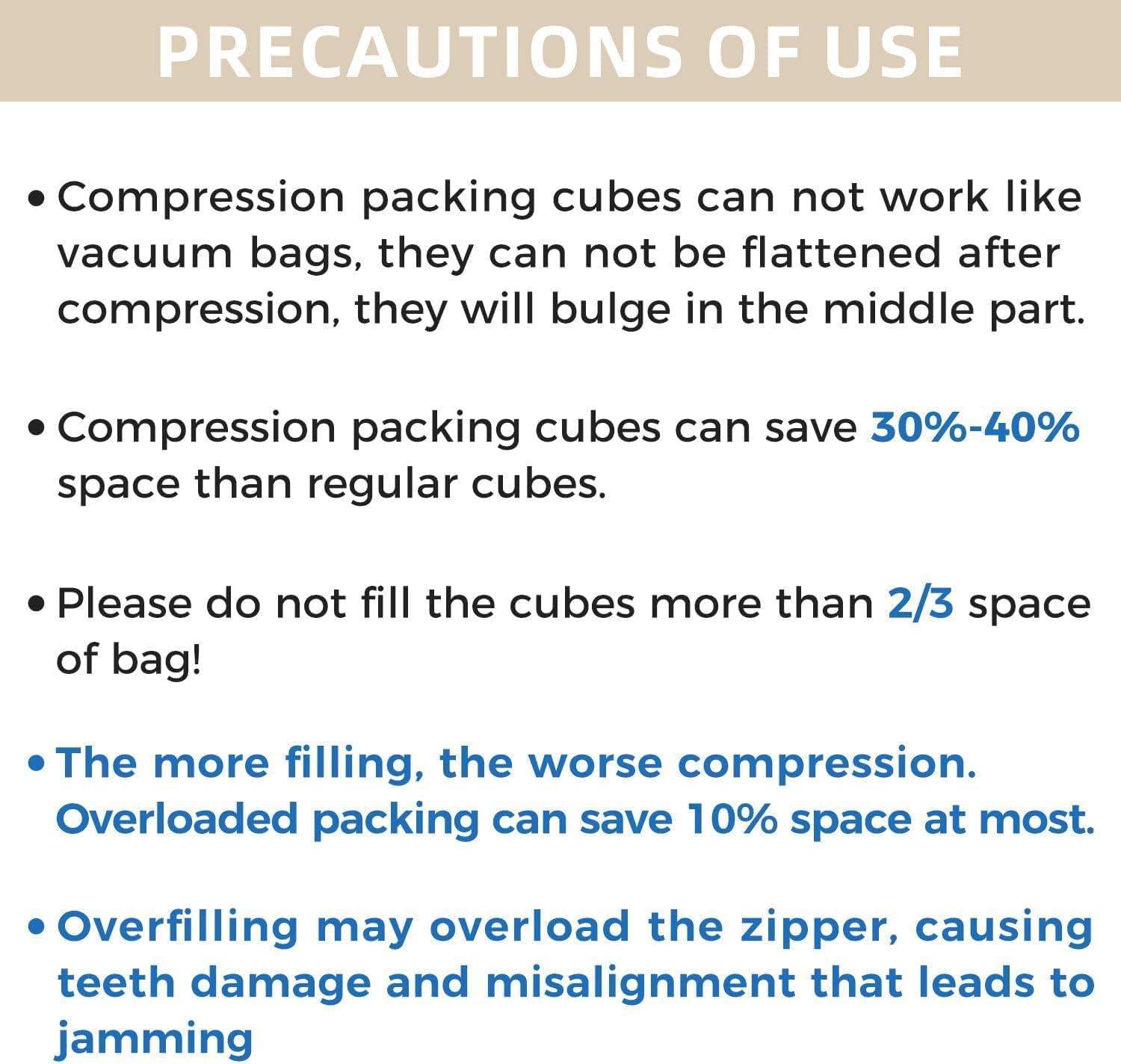 HOW TO MAKE THE COMPRESSION HAPPEN? – There Is a Extra Zipper Outside Of Our Compression Packing Cubes Which Can Be Zipped Up To Flatten The Cubes And Save The Space As Far As Possible. It Just Works Like a Vacuum Sealer. You Just Need To :1) Fold Your Clothes And Flatten Them 2)Pack Clothes In The Cubes And Zip The Normal Zipper. 3)Put A Finger On The Back Of The Zipper In The Space When Compressing The Packing Cubes In Case The Zipper Get Stuck In Fabric.