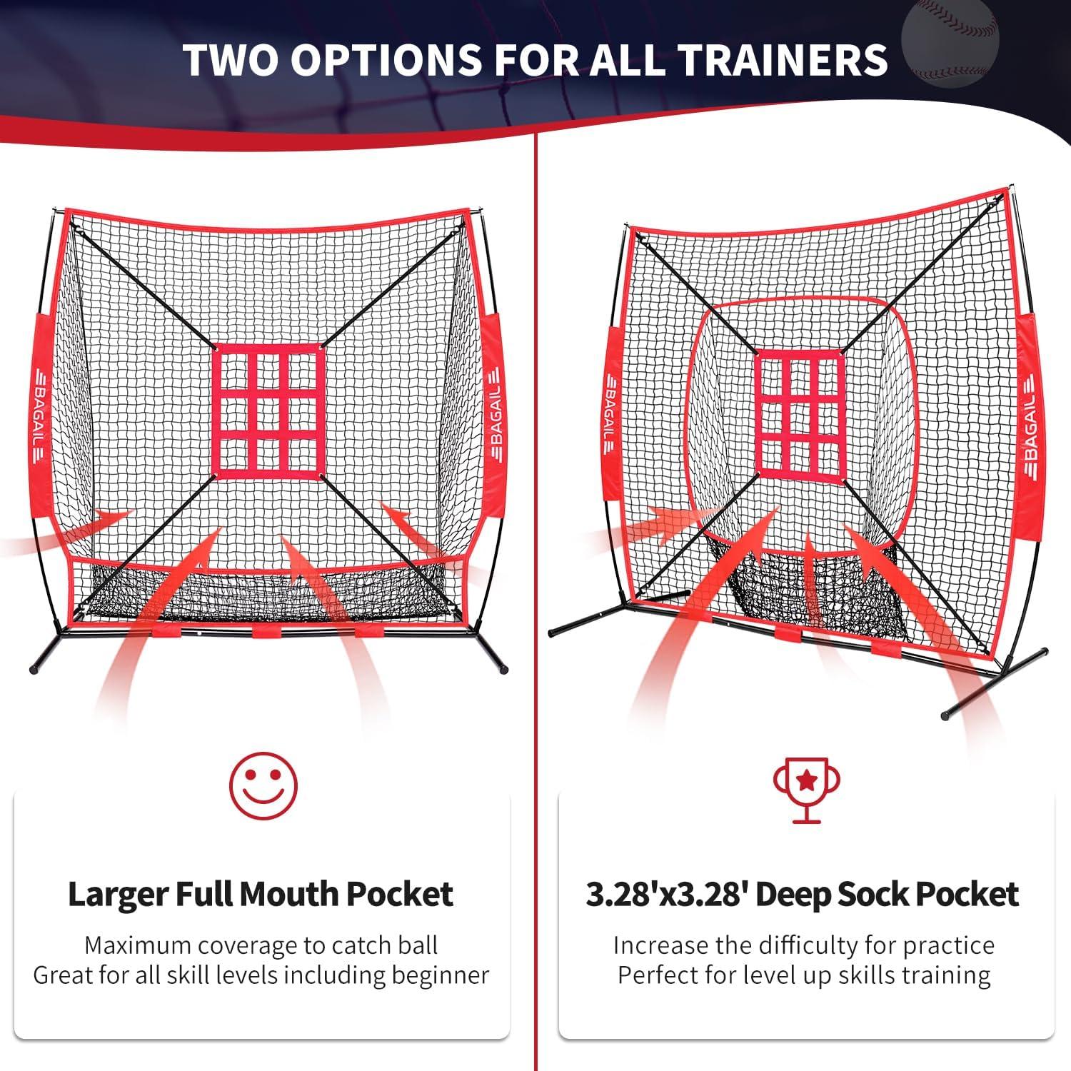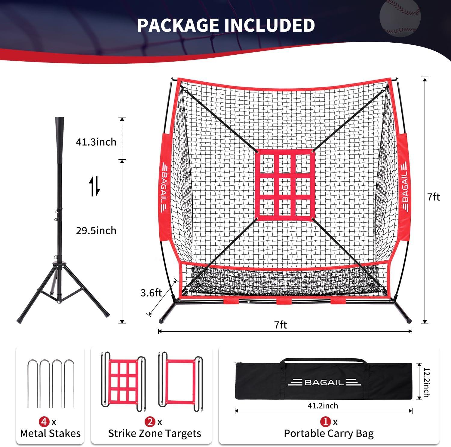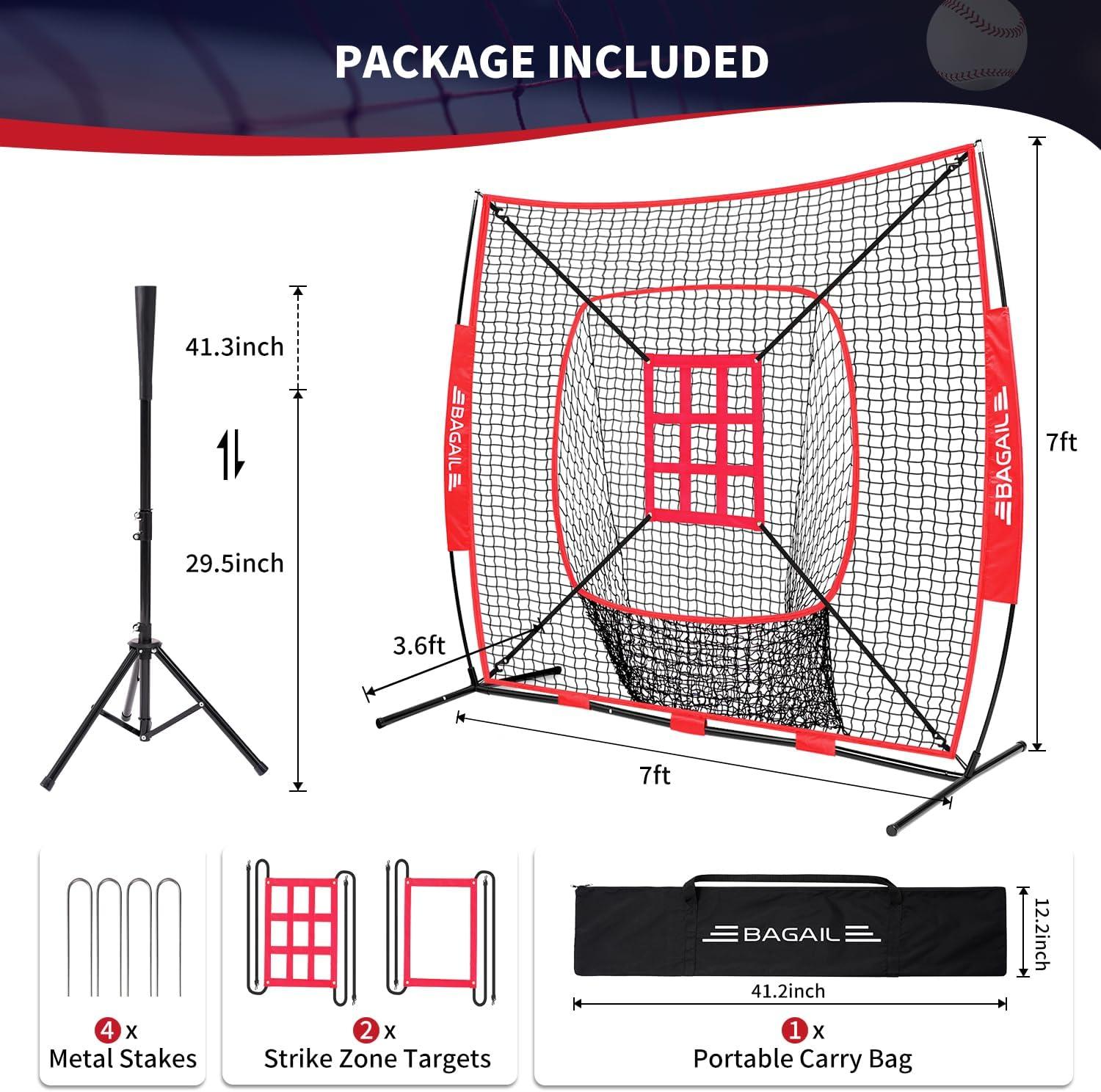 BAGAIL 7x7 ft Baseball & Softball Practice Net with Bow Frame for Batting, Hitting, Pitching, Portable Baseball Throwing Net with 2 Strike Zone Batting Tee, Carry Bag, Great for All Levels(Red)