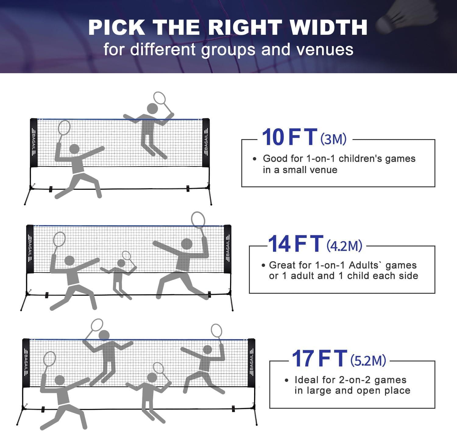 Multipurpose Sports Net: Available in 3 widths (3m/4.2m/5.2m) and adjustable heights (85cm to 153cm), BAGAIL sports net is an ideal tennis net, badminton net or kids volleyball net, in the yard, on the beach, the drive or any flat area. Have fun anytime and anywhere!