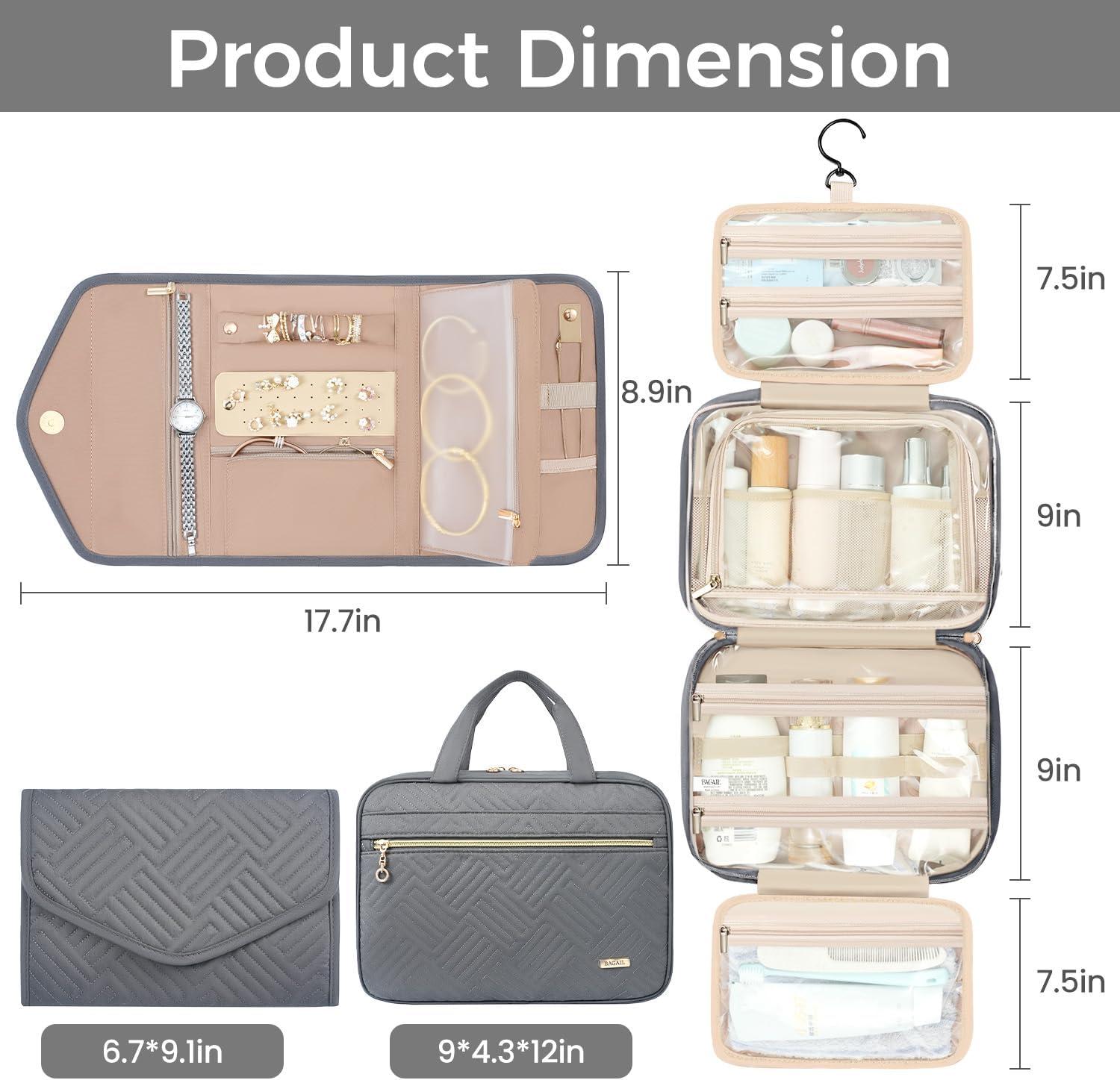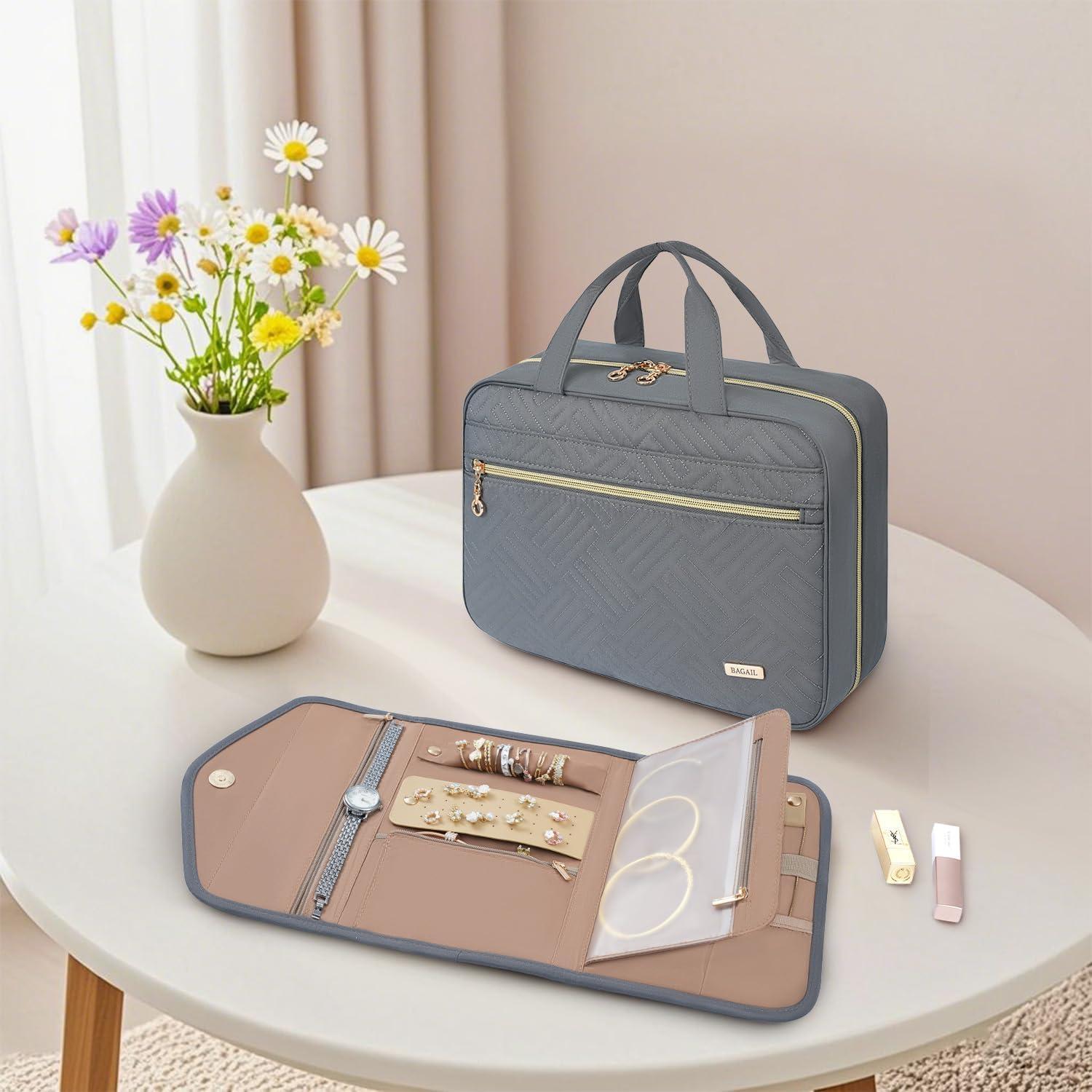 BAGAIL Hanging Toiletry Bag for Women Water-resistant Cosmetic Bag Large Capacity Travel Makeup Organizer for Full-Sized Travel Essentials(Classic+Jewelry Bag, Pink)(1-Grey)