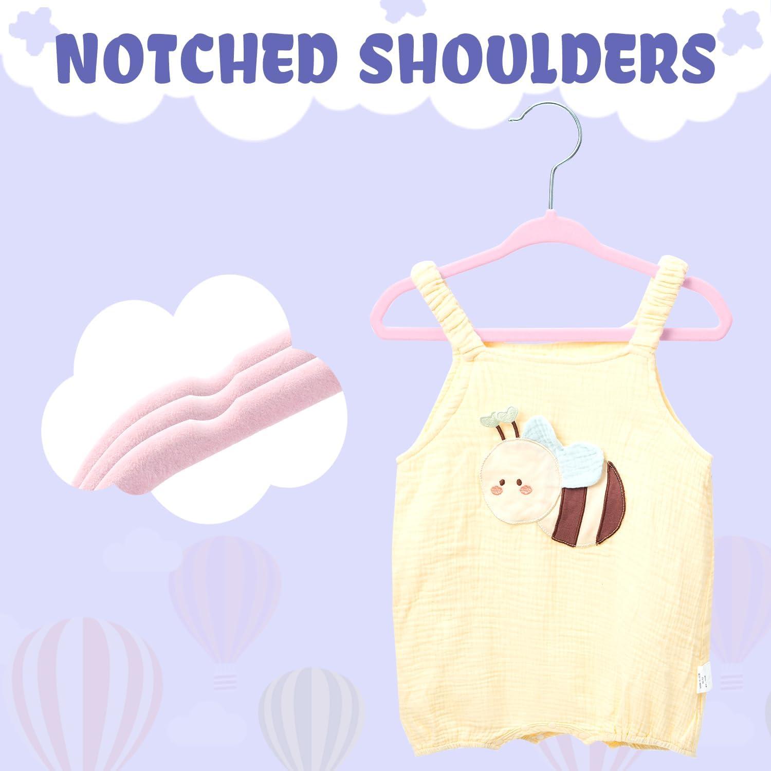 NON SLIP NOTCHES AND FLOCKED VELVET: Designed with 2 shoulder notches on both sides and covered with luxurious flocked velvet,Bagail children clothes hangers could grip delicate items such as camisoles, skirts and dresses with ease to prevent them from slipping off