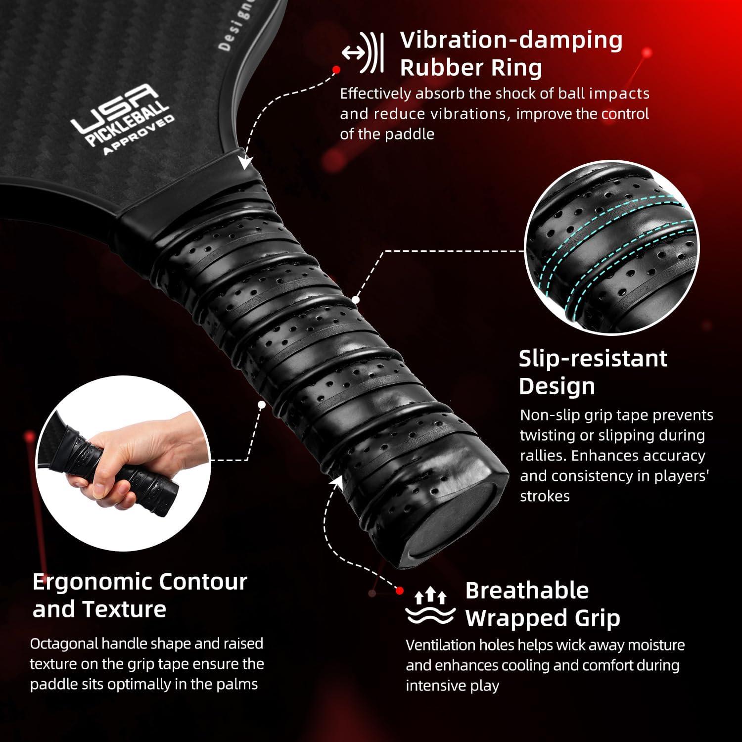 Comfortable Ergonomic Grip: Designed with a perforated, sweat-absorbent, and cushioned grip, these paddles offer superior comfort and grip for users. The 4.25″ grip circumference allows for maximum wrist snap and range of motion