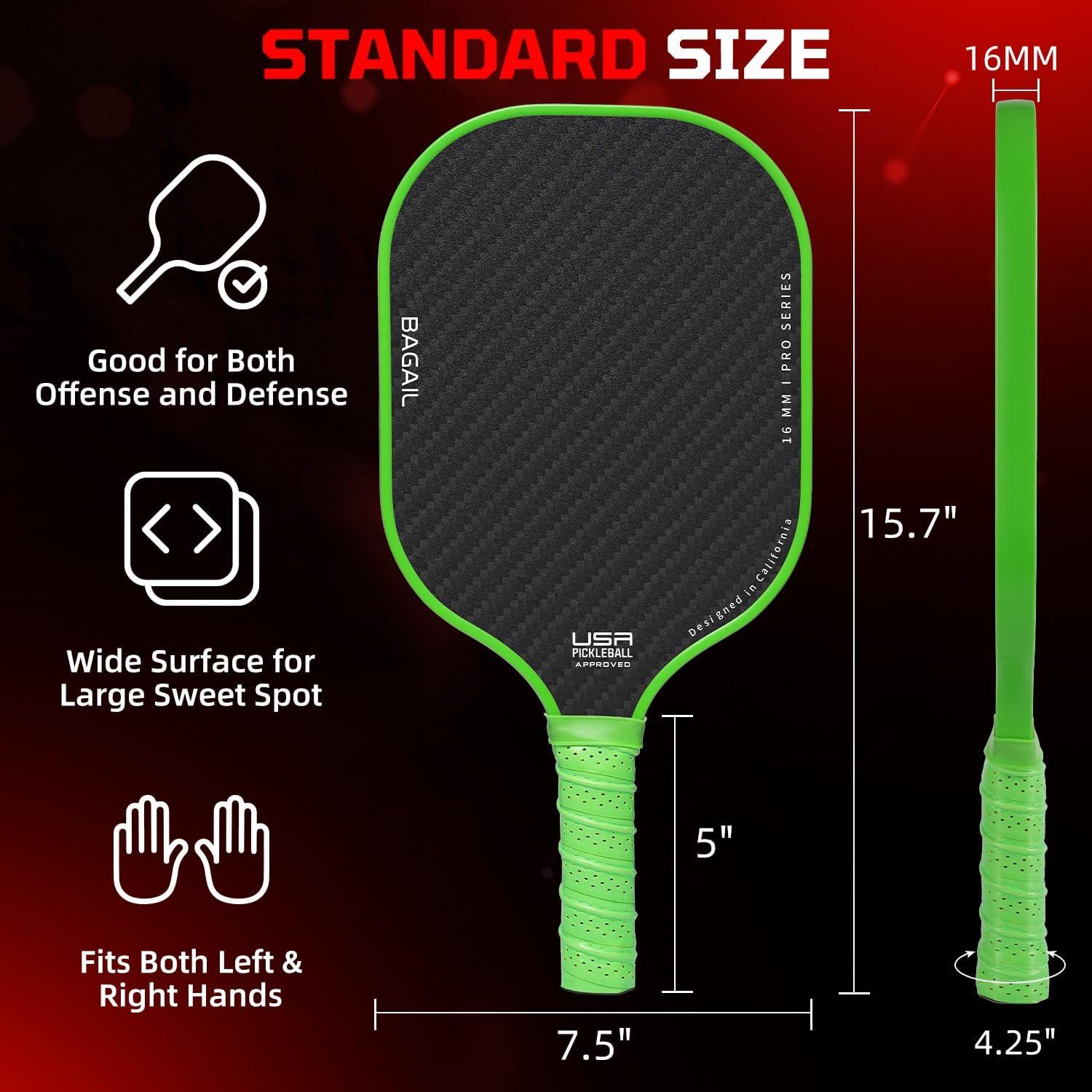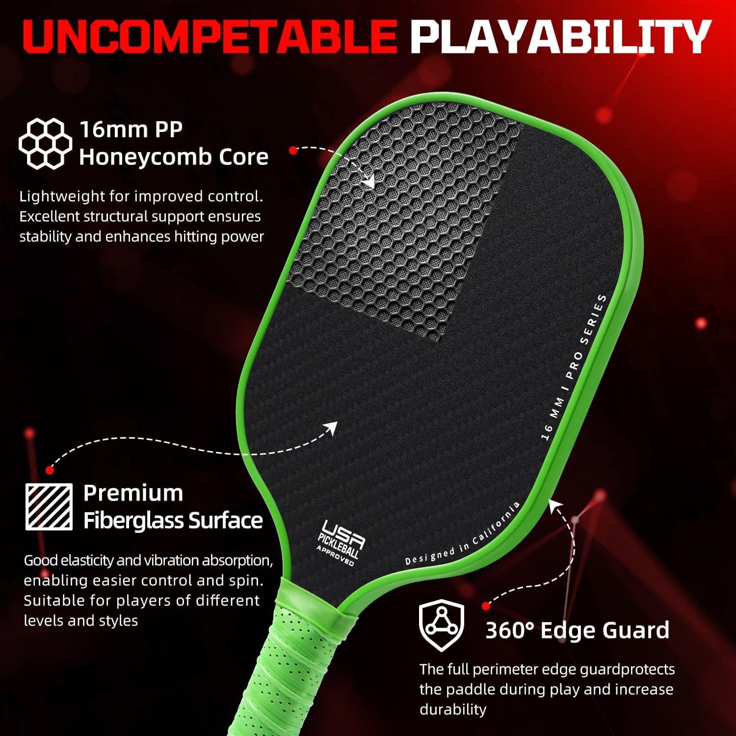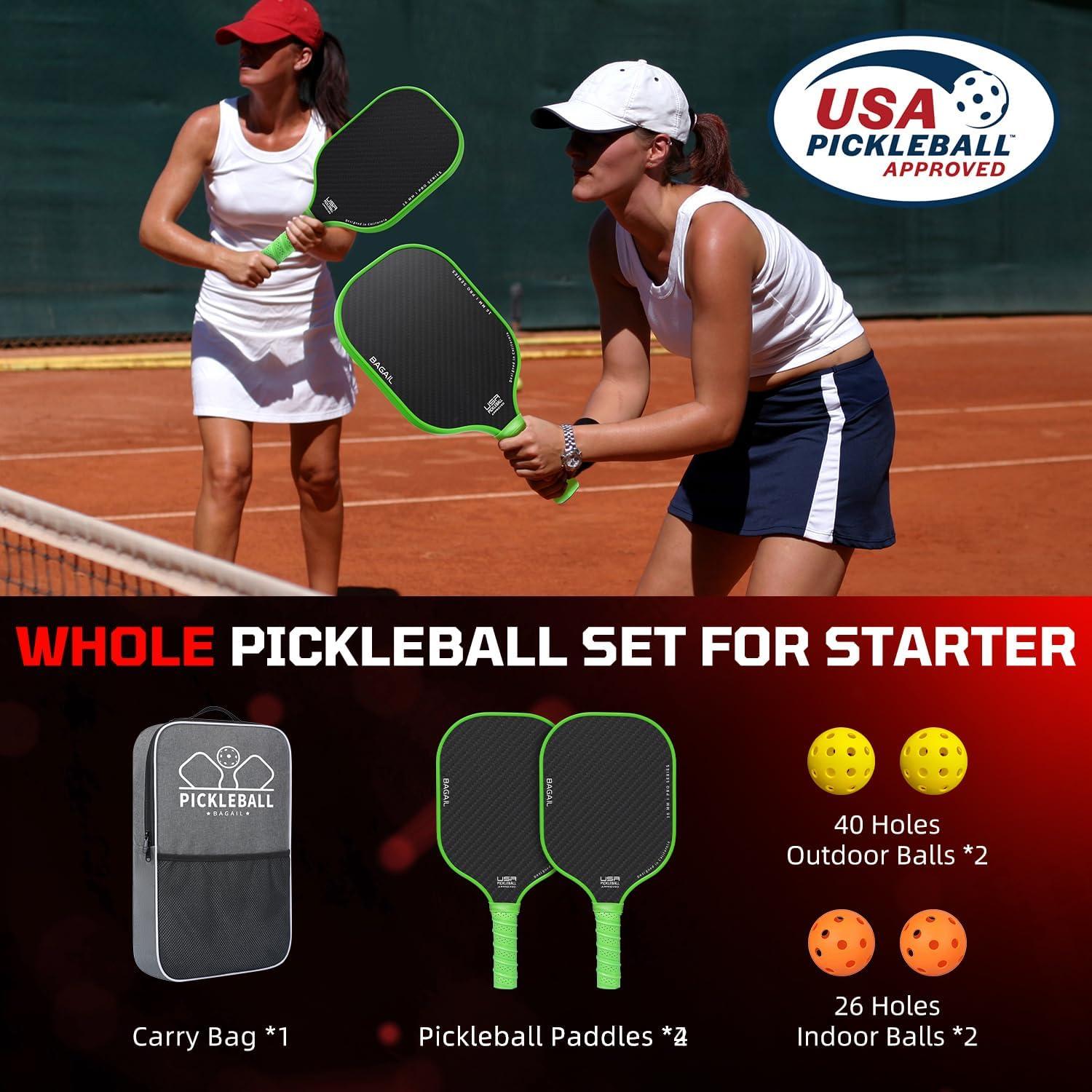 BAGAIL Pickleball Paddles, USAPA Approved Fiberglass Surface Pickleball Set, Lightweight Pickle Ball Rackets with 4 Balls, 1 Bag, Designed in California for Traction and Stability(Green)