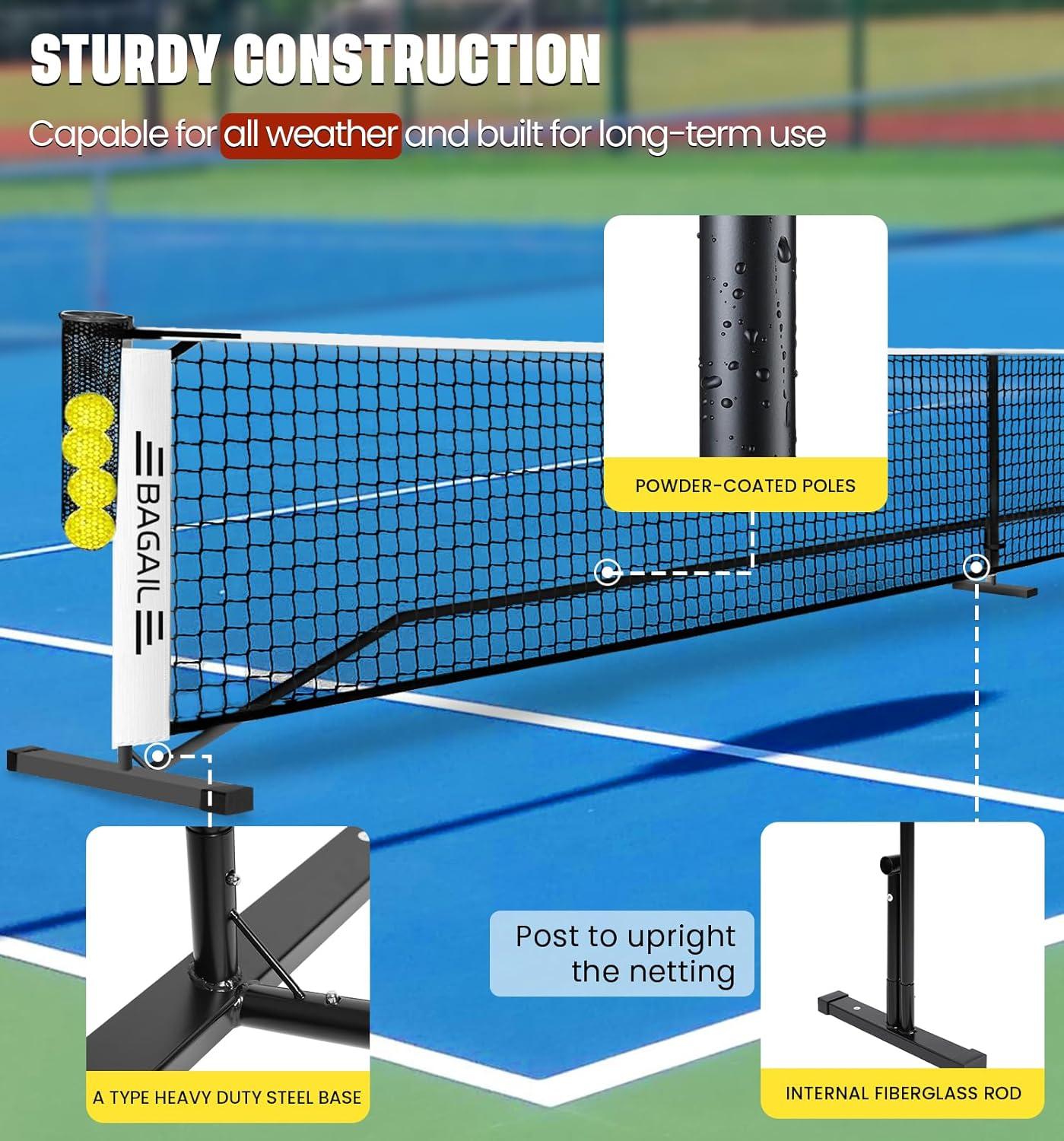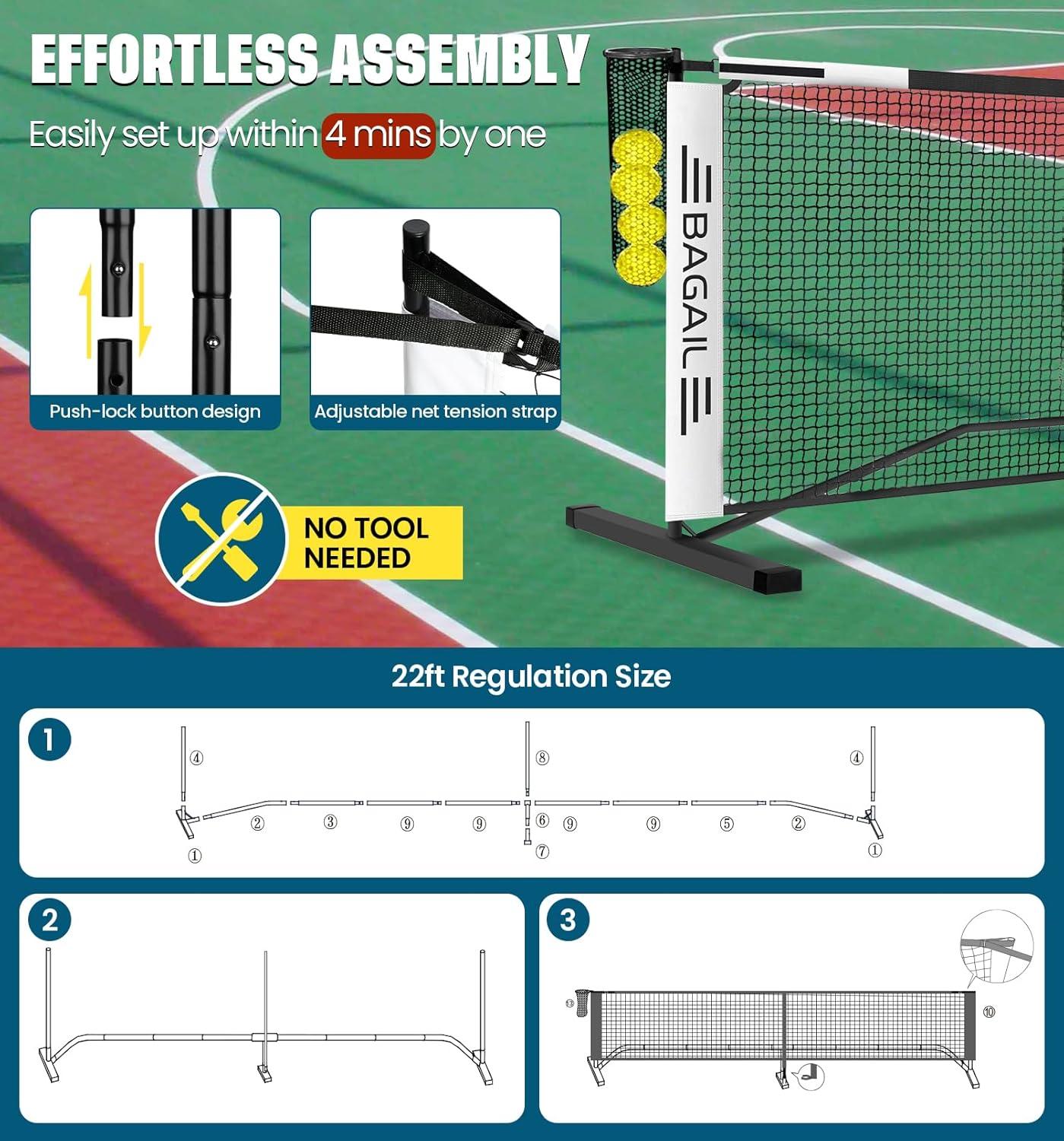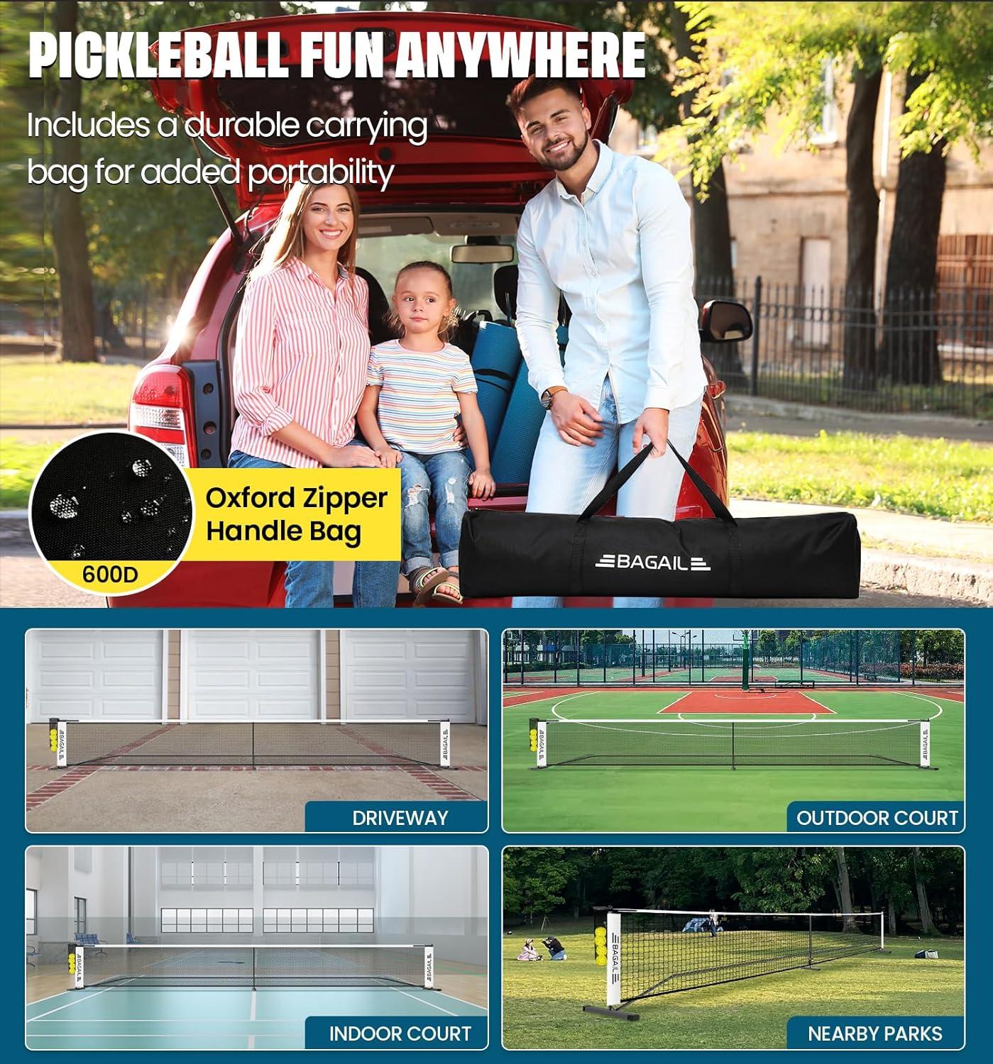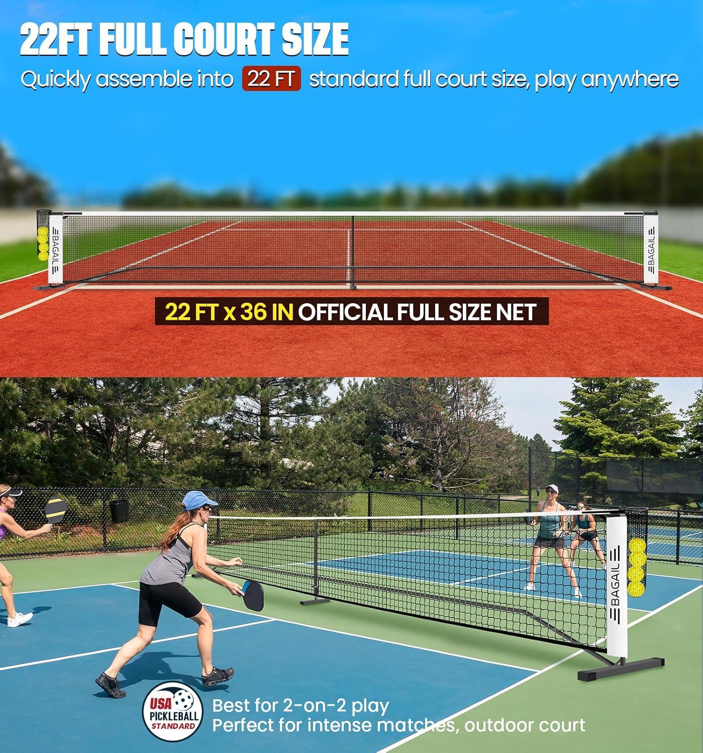 22FT Regulation Size: BAGAIL's latest portable pickleball net features full court size (36 “H x 22'W) that comply with USAPA regulations. You can play with family or friends anywhere – in your driveway or indoor court. Suitable for players of all ages and skill levels