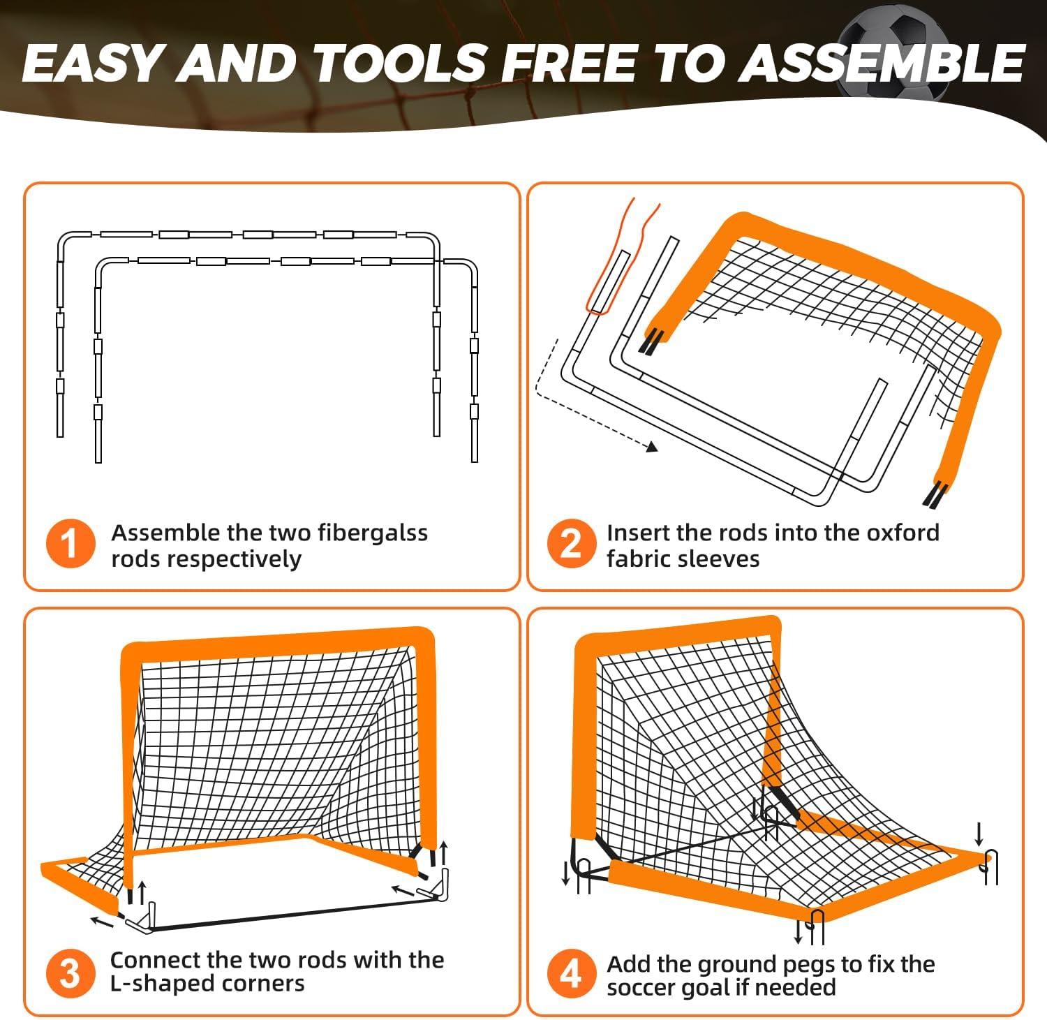 Easy Installation: Setting up the soccer net takes just 3 simple steps! Insert the fiberglass poles into the fabric sleeves, connect them with L-shaped joints, then secure the net to the ground using 8 heavy-duty stakes. Even outdoors, it withstands strong winds and impacts
