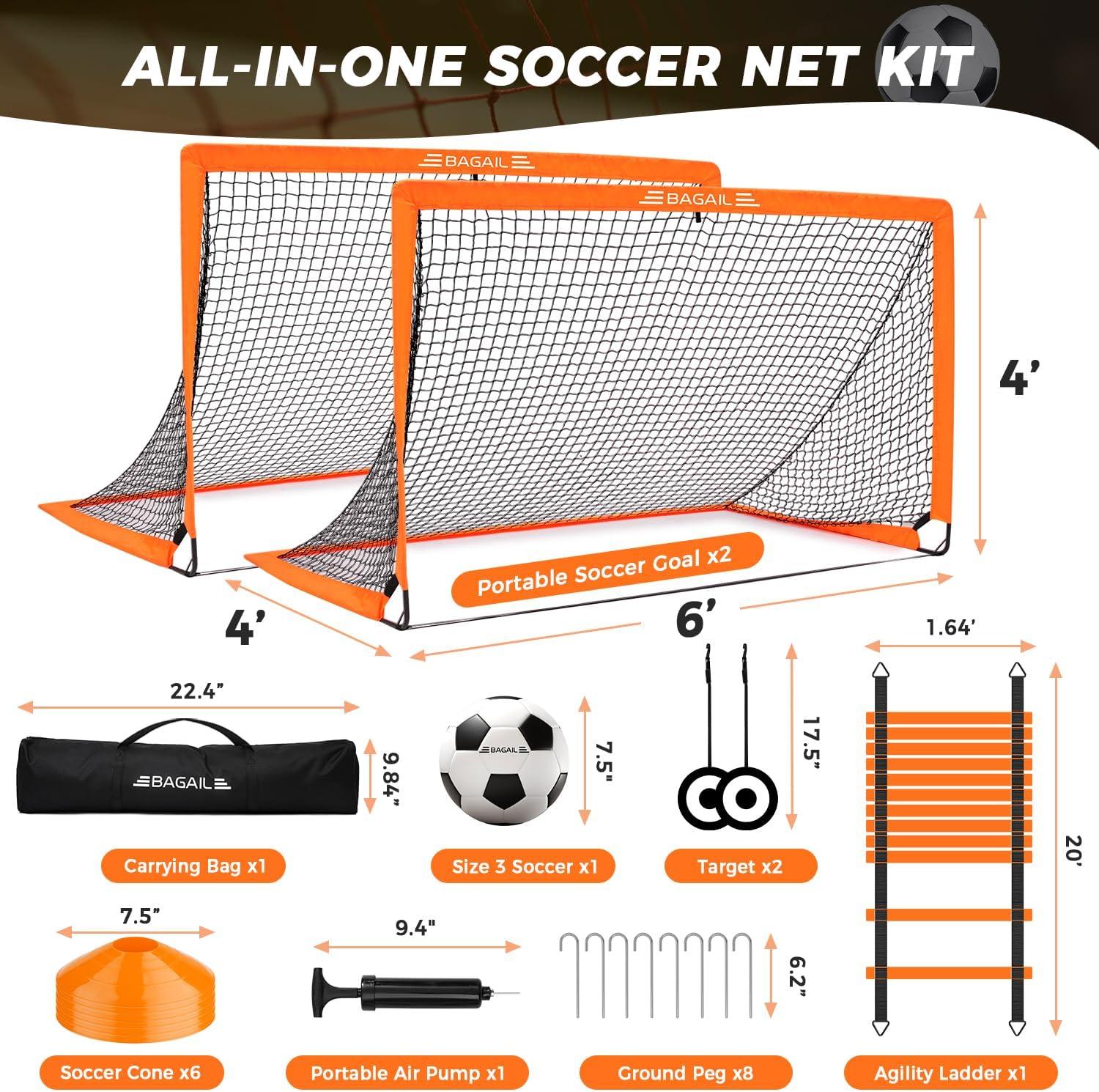 All in One for Soccer Fun: BAGAIL soccer net set contains 2 set of 6' x 4' soccer goals, 1 20' training ladder, 1 soccer, 1 air pump, 6 cones, 8 J-shaped ground stakes, and 1 carry bag. Whether you’re practicing shooting accuracy, goalkeeper skills, or organizing friendly matches, this portable outdoor soccer net set is your ideal choice