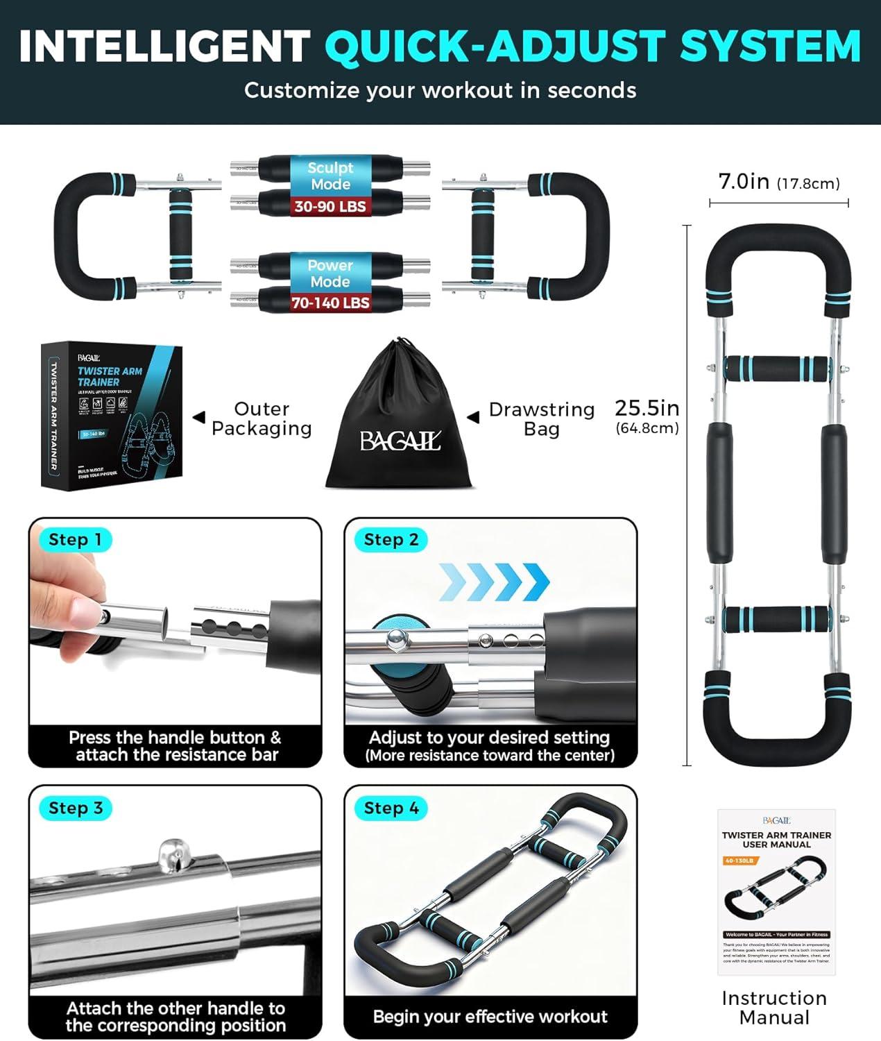 BAGAIL Twister Arm Trainer, 5 or 9 Level Resistance (30-140 lbs) for Chest & Arm Workout, All-in-One Home Gym Strength Training Equipment with Ergonomic Grips & Carry Bag for Men and Women