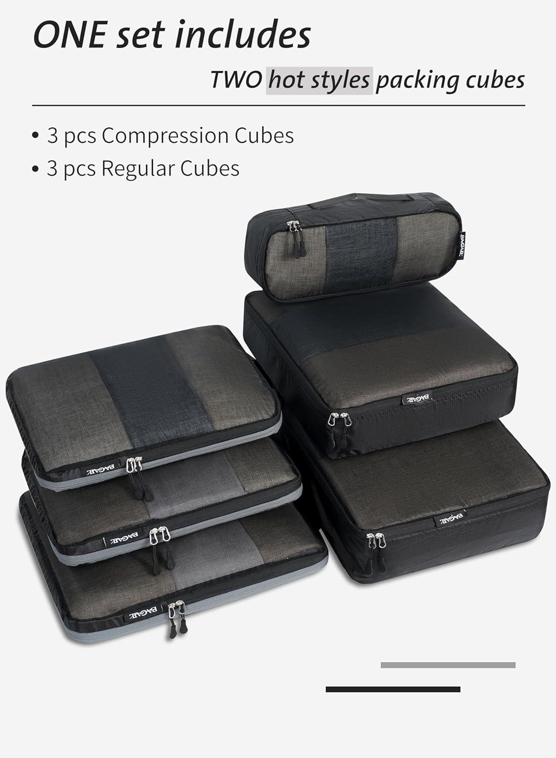 Bagail Ultralight Compression Cubes 7 Set – 3 Packing Cubes, 3 Organizers, and 1 Shoe Bag(Black)