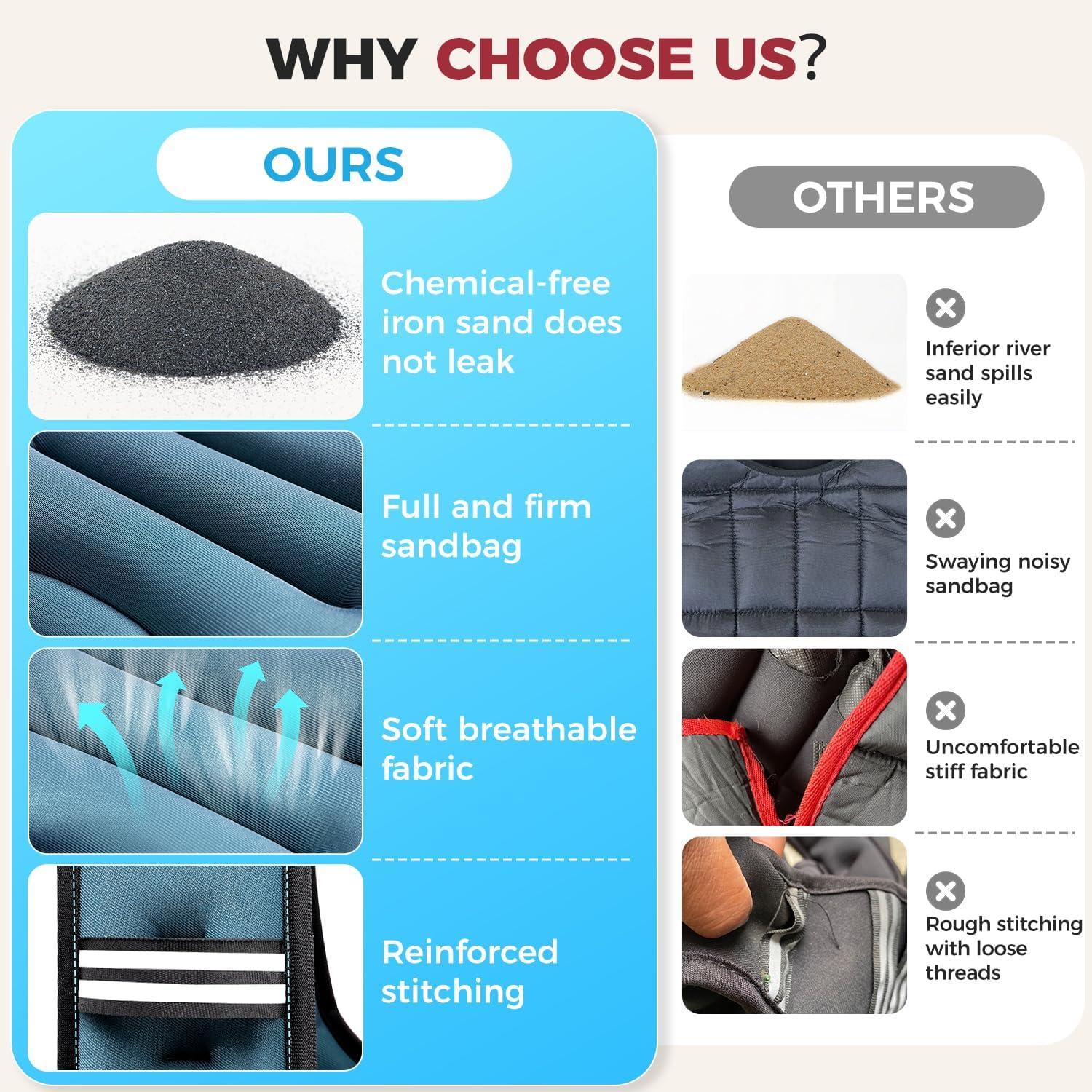 Superior Performance: Our weighted vest features upgraded iron sand with even weight distribution, maximizing workout efficiency and minimizing injury risks. Reinforced double-stitched seams prevent sand leakage, ensuring a secure and durable experience for safe, effective training