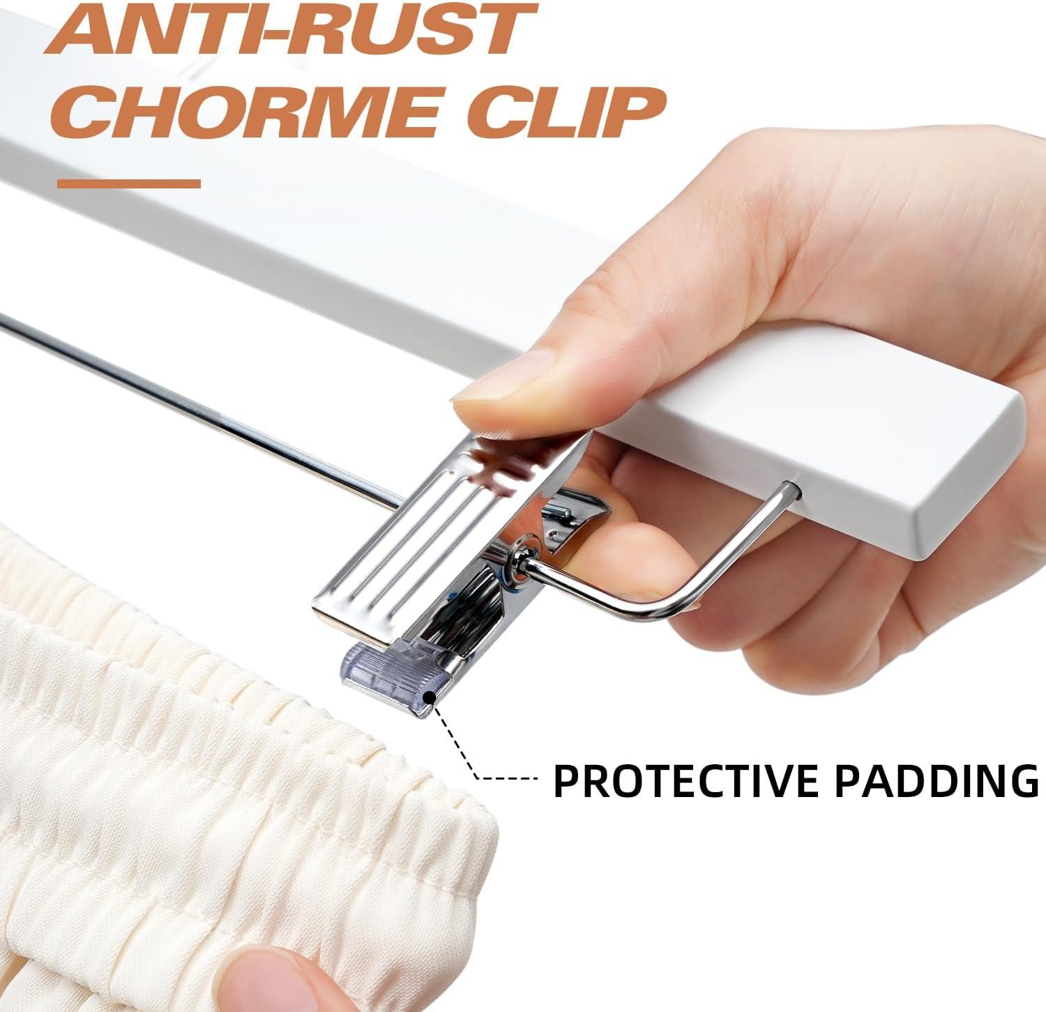 ADJUSTABLE CLIPS: The clips do a good job! There are rubber pads inside of the clips that not only hold clothes securely but also protect clothes; And the clips slide easily to hang different sized clothes